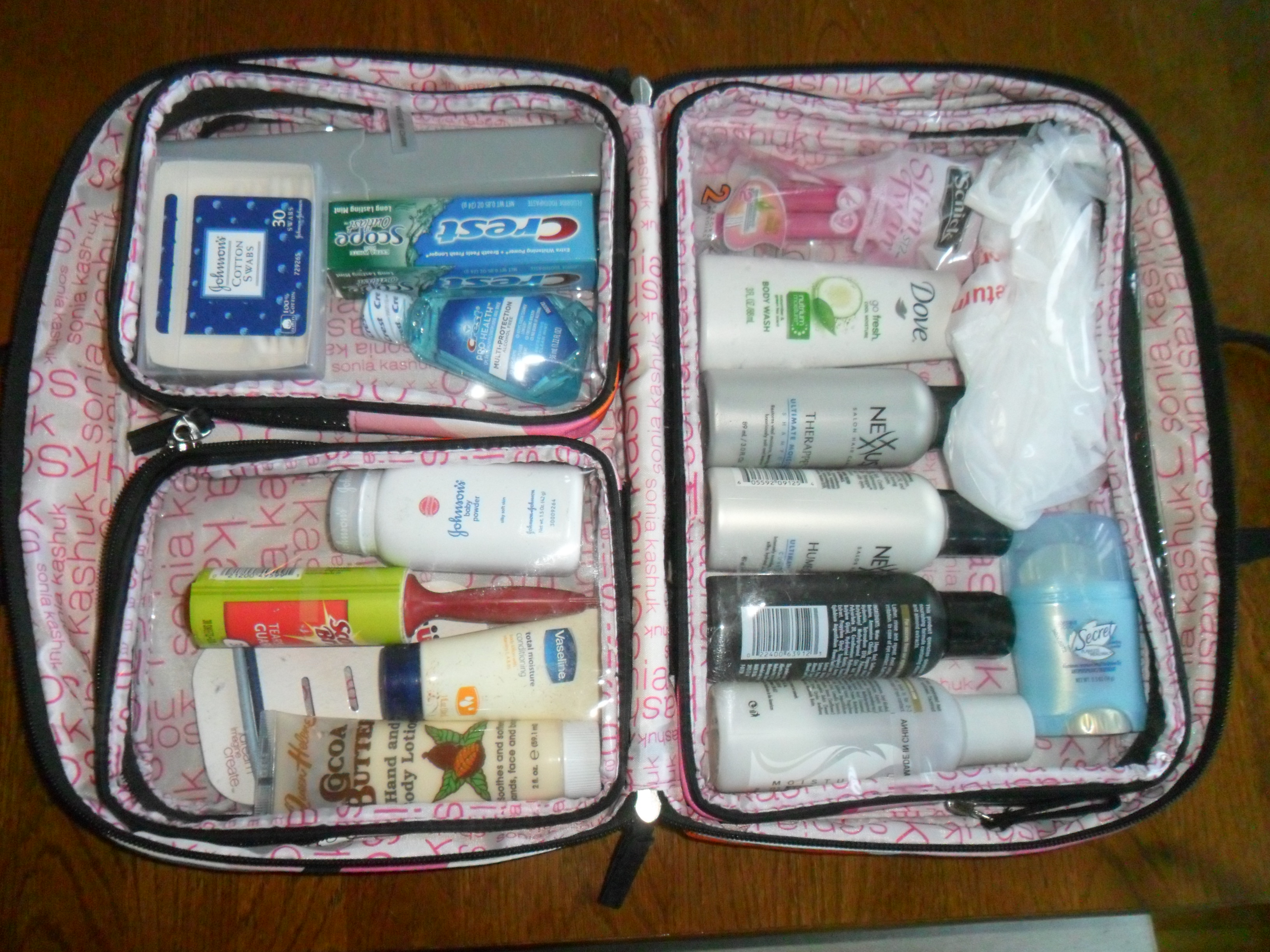 There are three compartment. My essentials are shampoo, conditioner, body wash, deodorant, razor, hand/body lotion, hair ties, lint brush, toothbrush, toothpaste, mouthwash, Q-tips, and a plastic bag (which I use for anything that may be wet on the day I am packing to leave.)