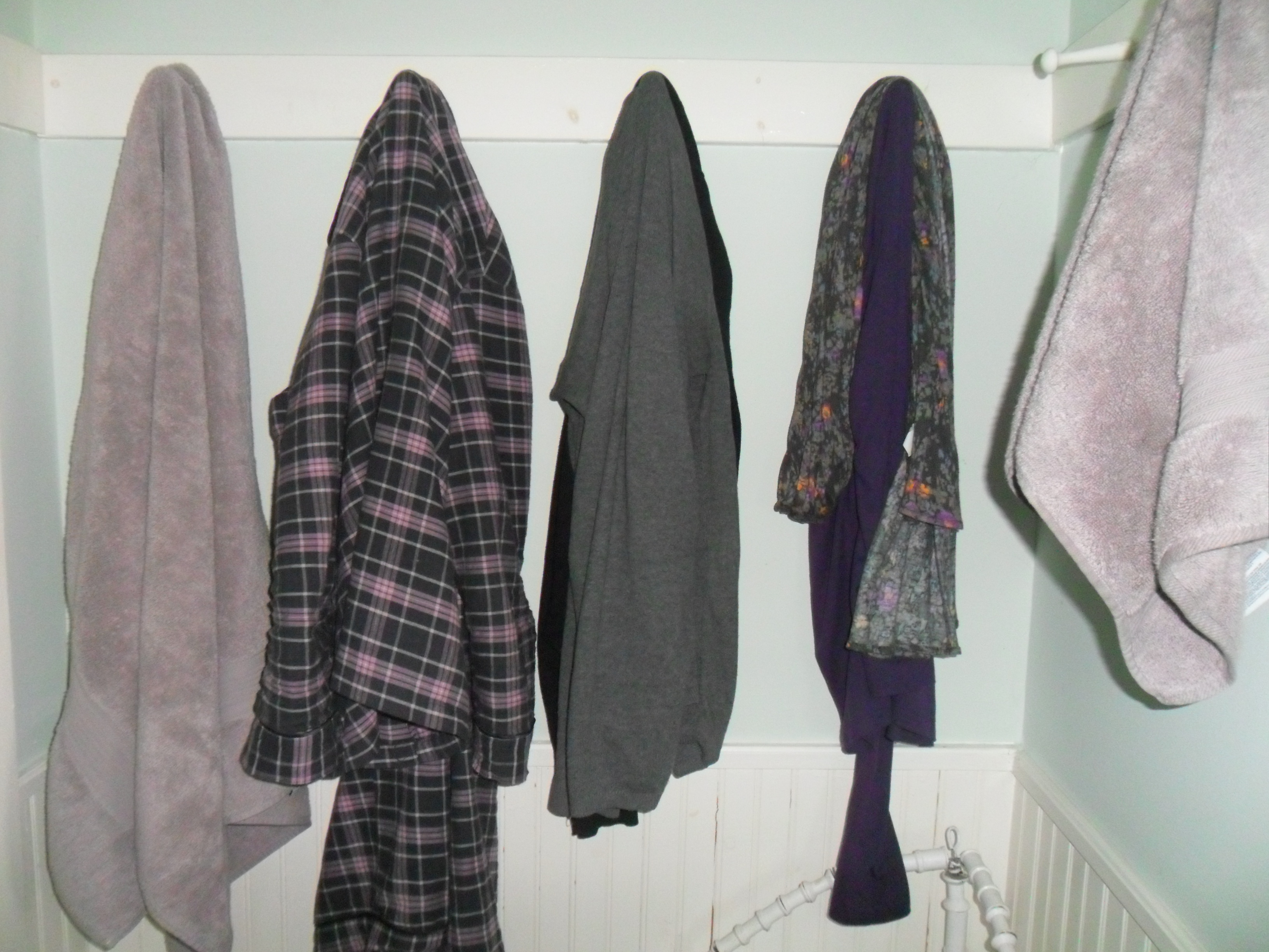 I also snapped this shot of my clothes hanging on hooks during my trip to show you how everything was one color palette (see Practical Packing 1)! Even my pajamas and towels were in the same color family. Not because you have to match when you go to bed or take a shower, but because when I got home I only had one load of laundry to do!