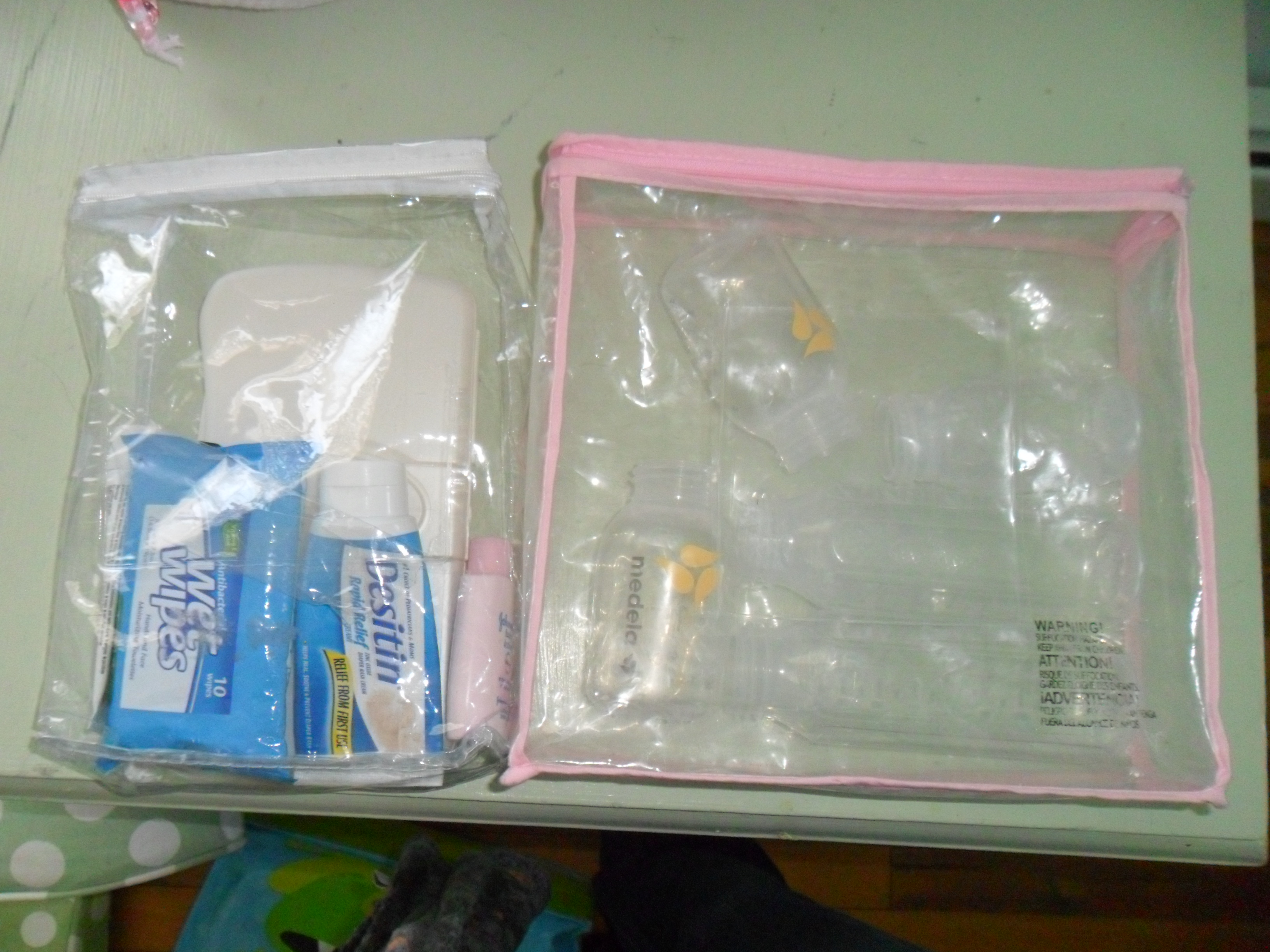 Since I am also traveling with a baby, I have even more things I have to bring along! I always save the plastic cases that pillowcases, sheets, and bedding come in. Before Olivia, I stored my crafting supplies in these. Now, they serve as baby travel kits. I put a few diapers, a thin wipes case, Desitin, baby lotion, and hand sanitizer in one plastic case. I can easily throw this in my purse with the folding changing pad so when we stop at rest stops I don’t need to bring a huge diaper bag in with me. The larger cases (from complete sheet sets) I use to hold all of her bottles.