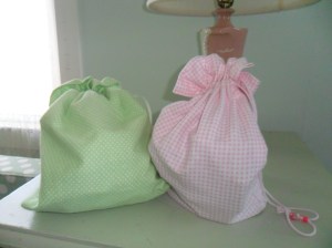 In addition to these items, I also use more of my sister’s homemade bags to help pack up Olivia’s stuff. She gave me these at my baby shower. The pink gingham bag I use to put all of her baby food jars and spoons and in the green polka dot bag, I pack as many diapers as I can possible stuff in there!