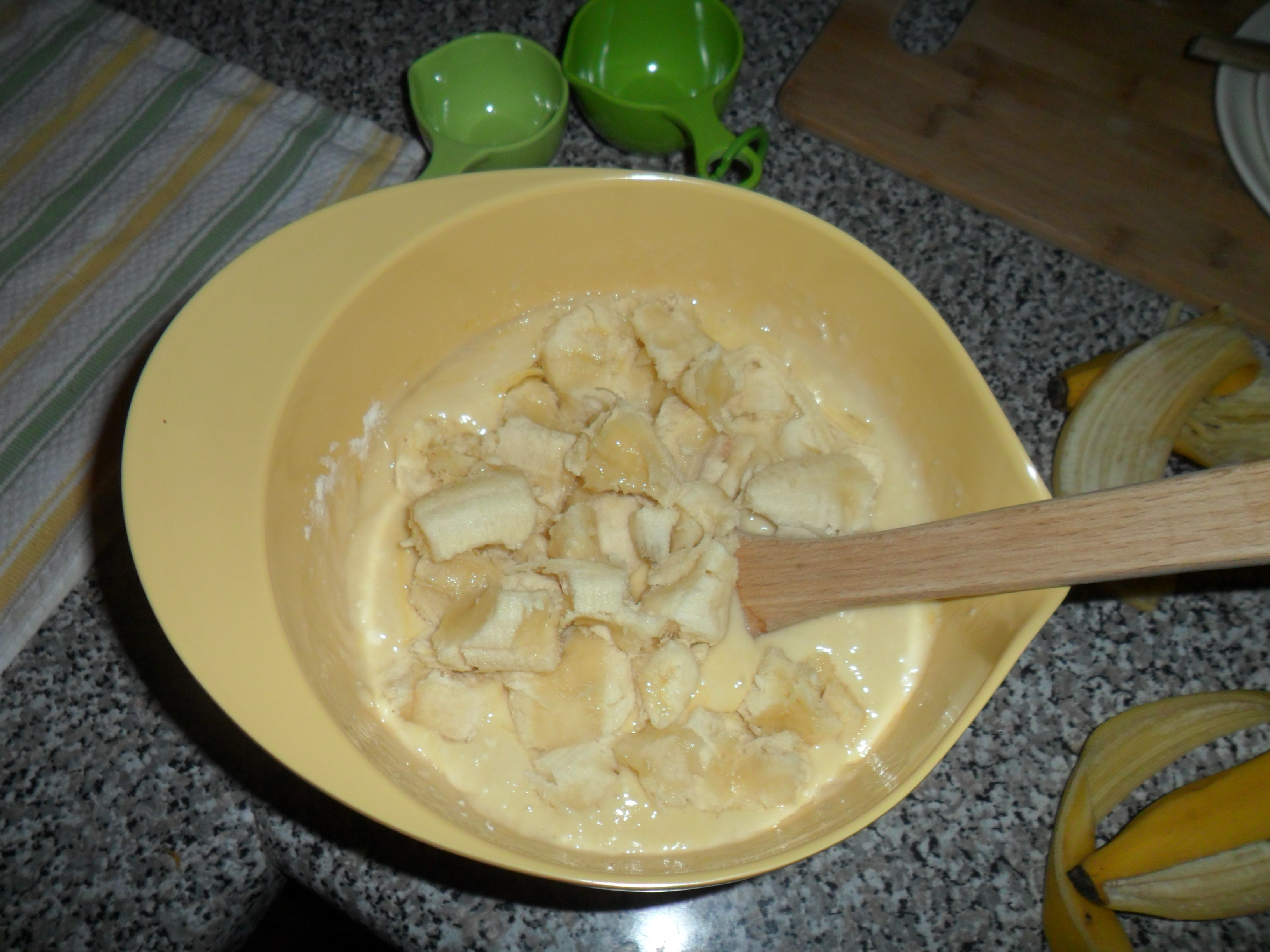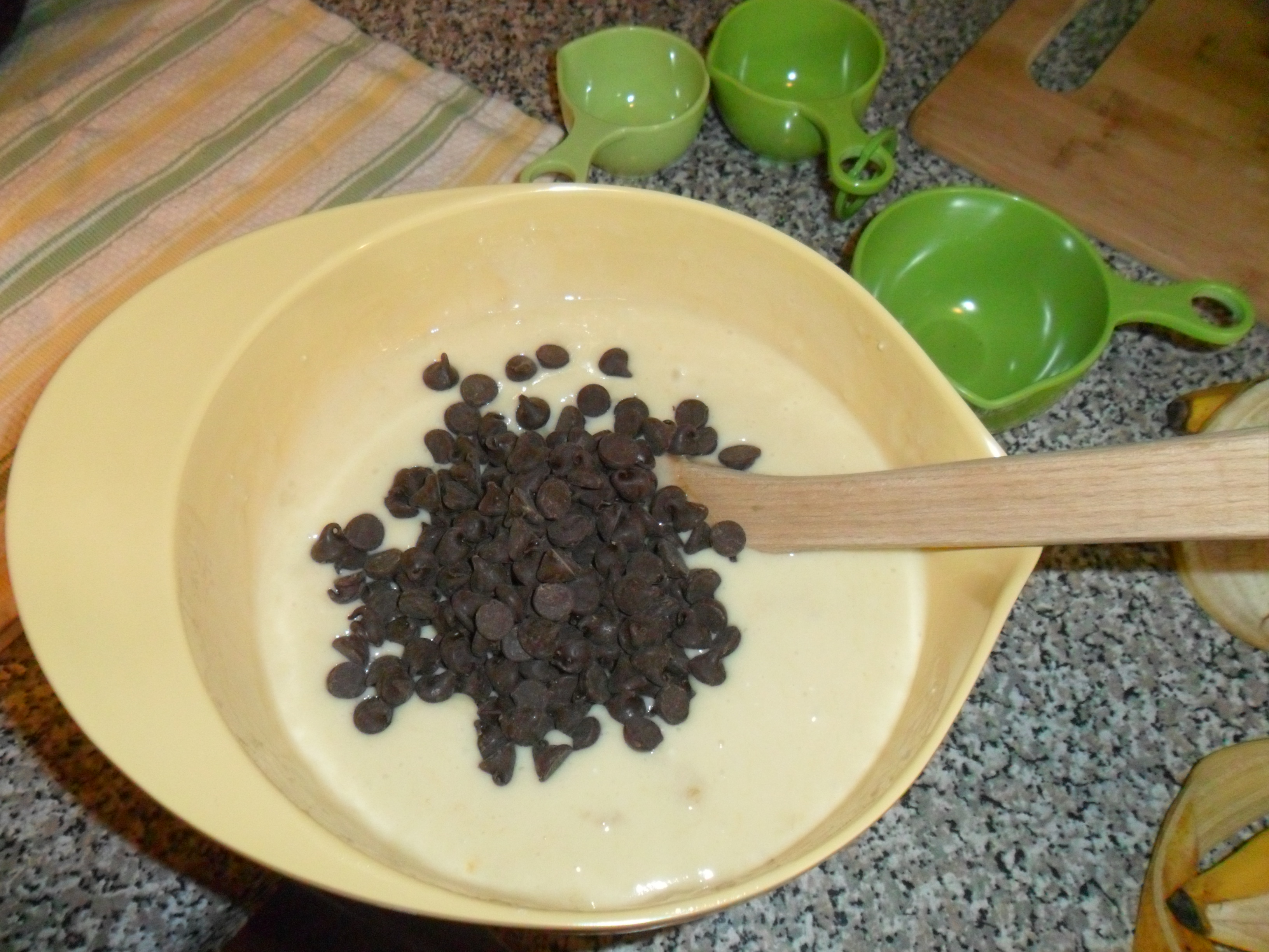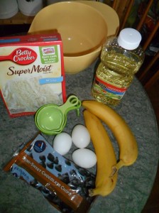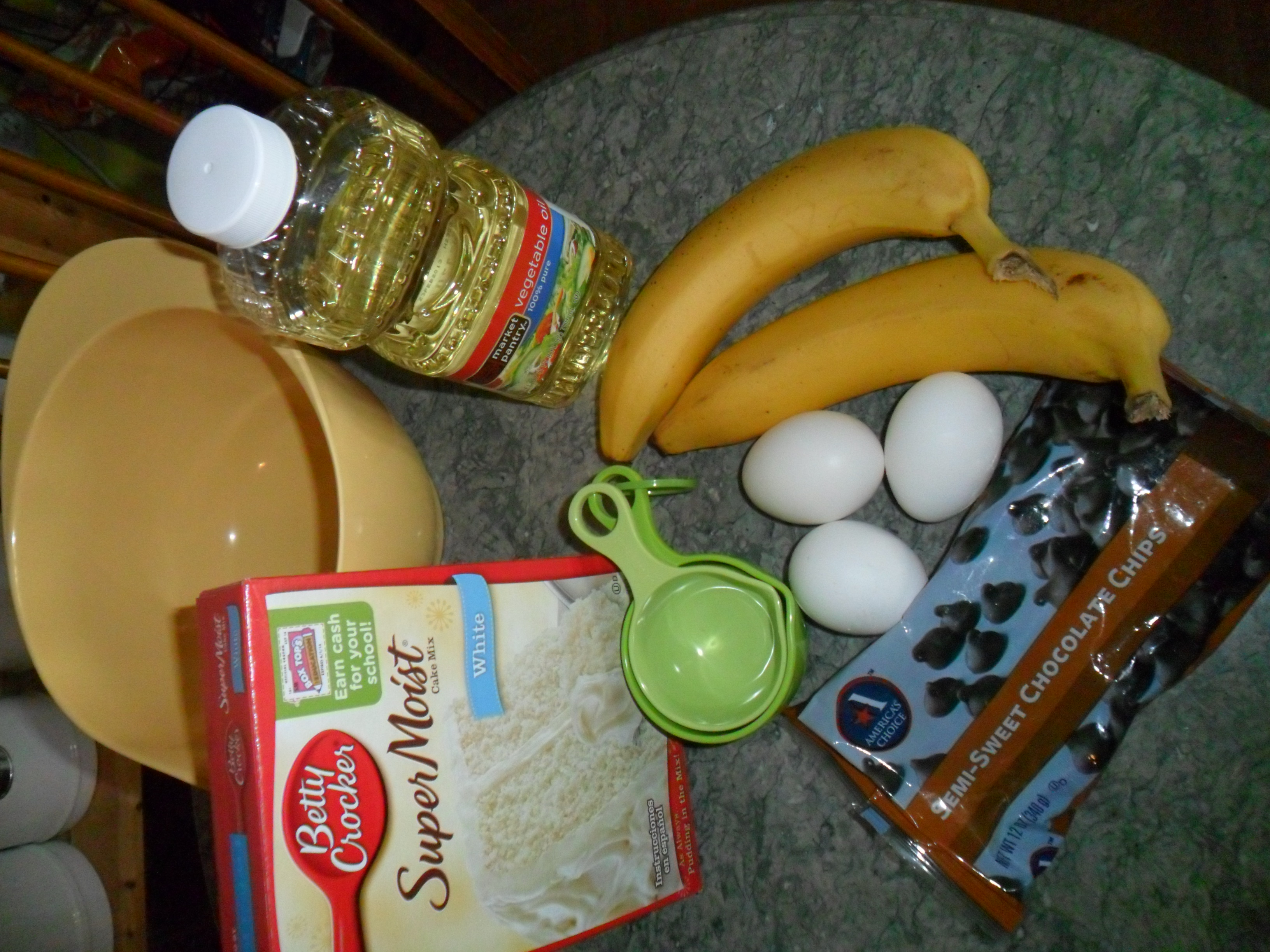 All the necessary ingredients: white cake mix, vegetable oil, eggs, water, bananas, chocolate chips, chocolate frosting.