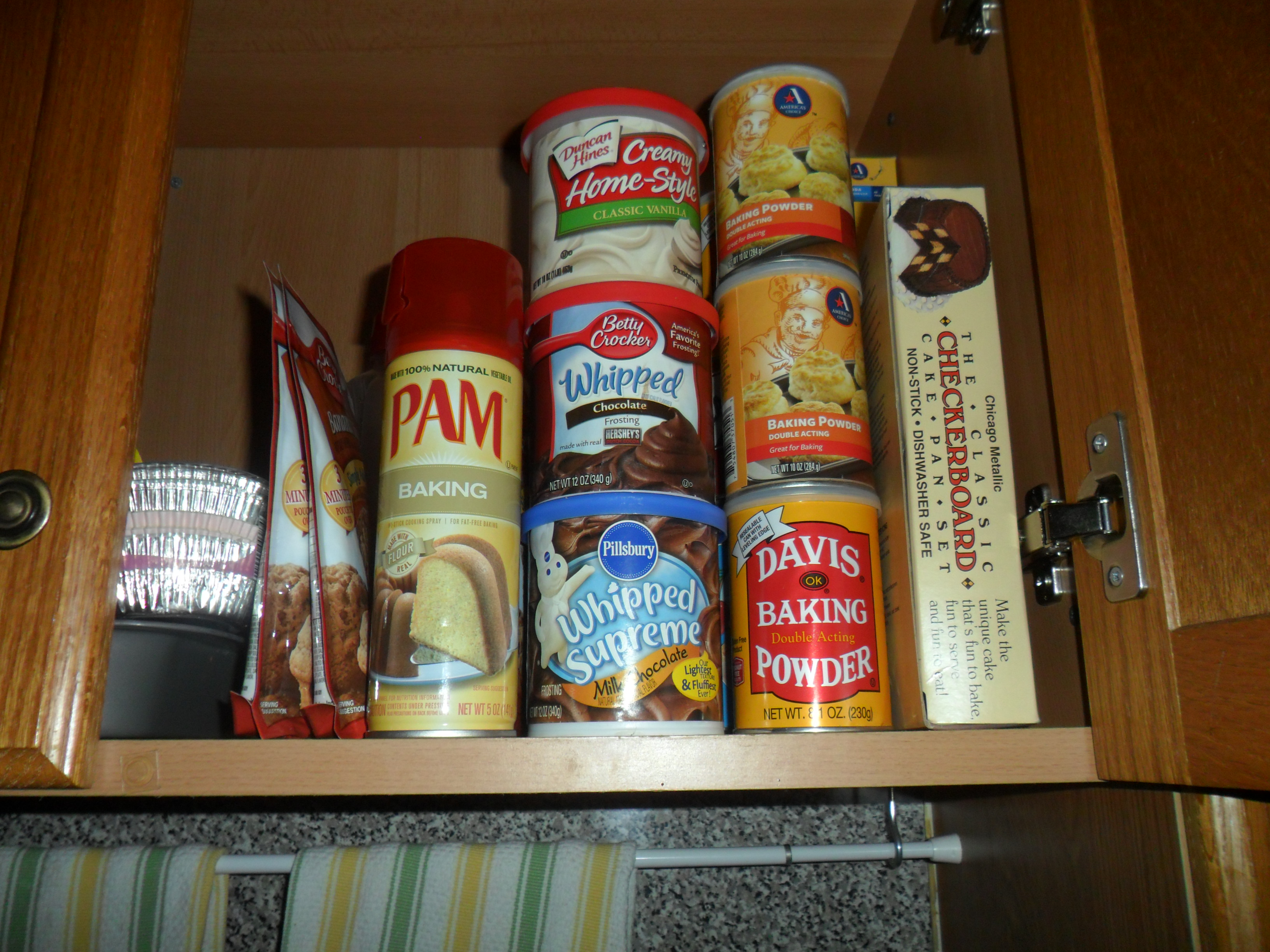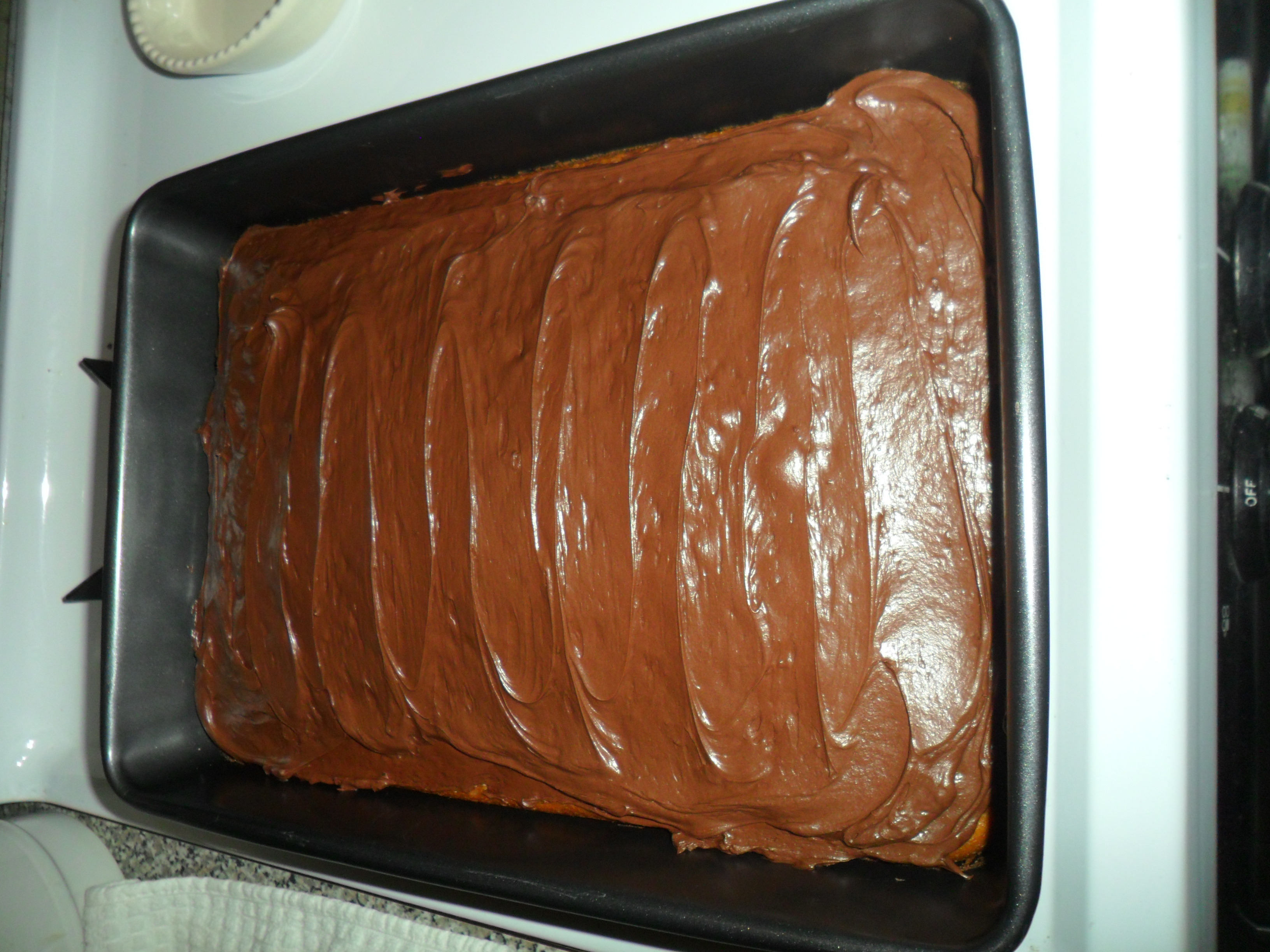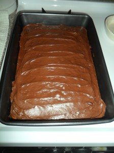 While it’s baking, get the frosting ready – you can melt it or not. I usually don’t because nine times out of ten I am making it at night to refrigerate overnight, and personally I don’t like melted frosting that immediately gets put into the refrigerator instead of served right away. Here I have different frostings stacked in my cupboard. I choose milk chocolate frosting for this cake.