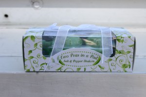 Green Two Peas in a Pod salt and pepper shakers – our favors for our guests.