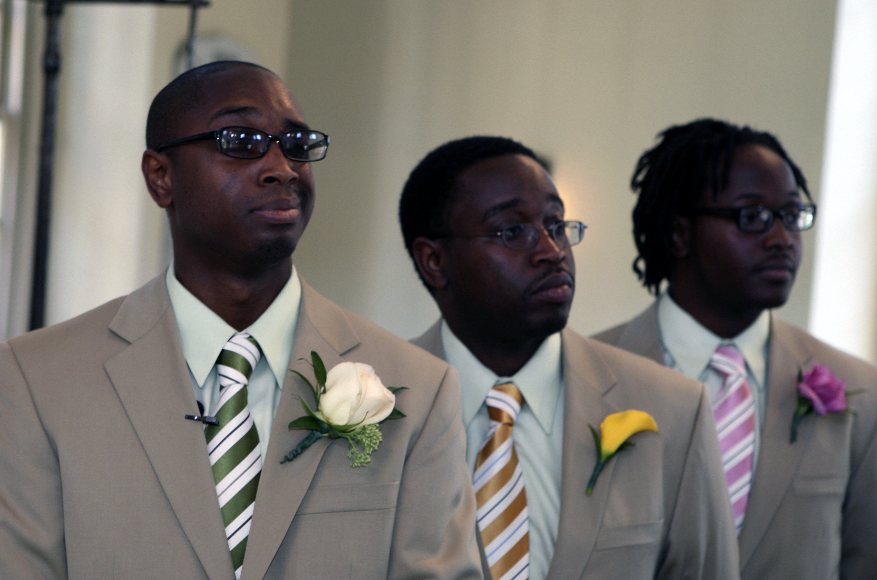 They also each carried different flowers. The colors matched the tie of the groomsman they were partnered with. (Many men commented on the fact that the guys were wearing different color ties! They joked that usually men didn’t have such choices!)