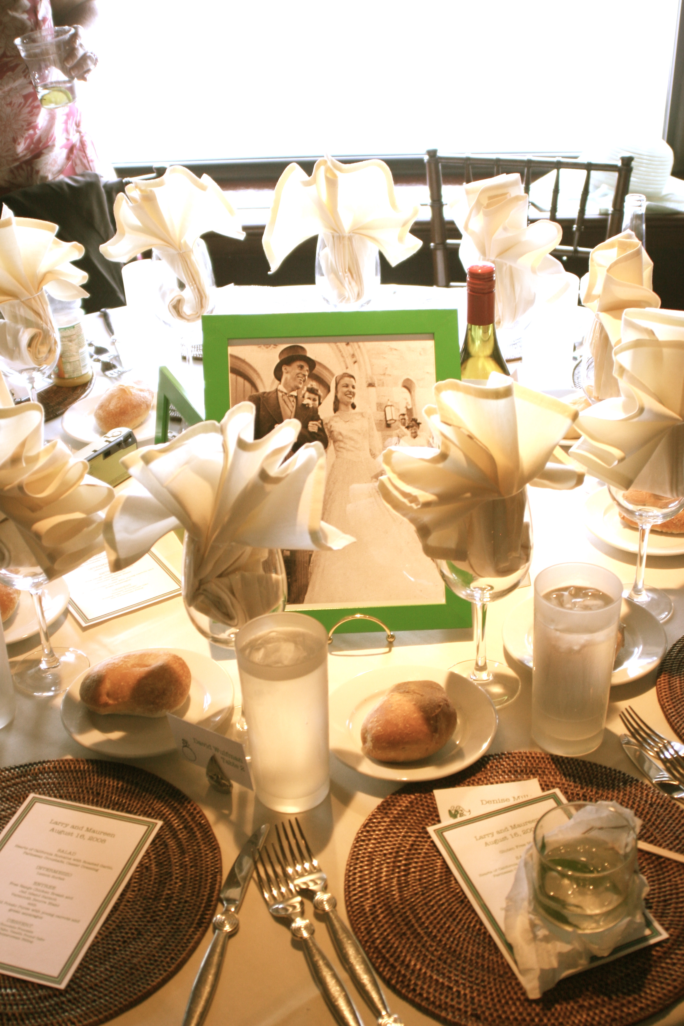 For our dinner centerpieces, we framed wedding photos of our family members in green frames (from IKEA!) Here is my Uncle Bill and Aunt Joan who married in 1950. My mom was the Maid of Honor. You can also see our DIY menus.