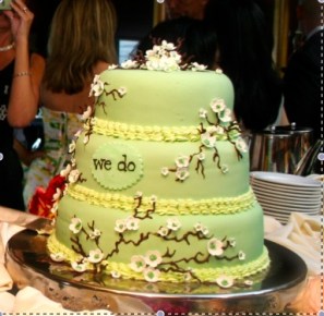 The place cards were printed in green and I alternated stamps of a diamond ring, a bride and groom, and the words “we do.” The place card holders were tiny silver ships, since our reception was on a ship. (Yes, I collected up the ones people didn’t take and I still have them!)