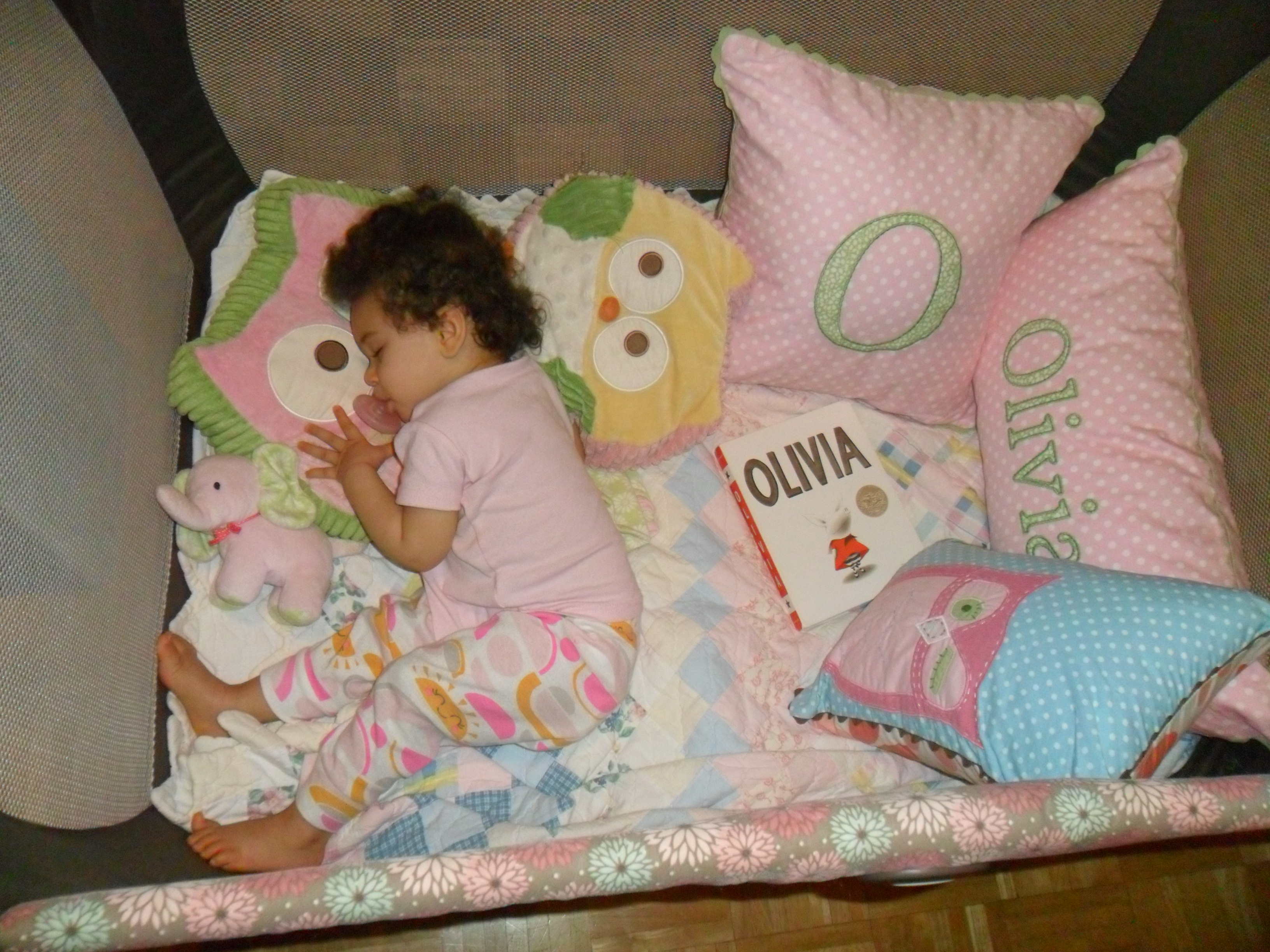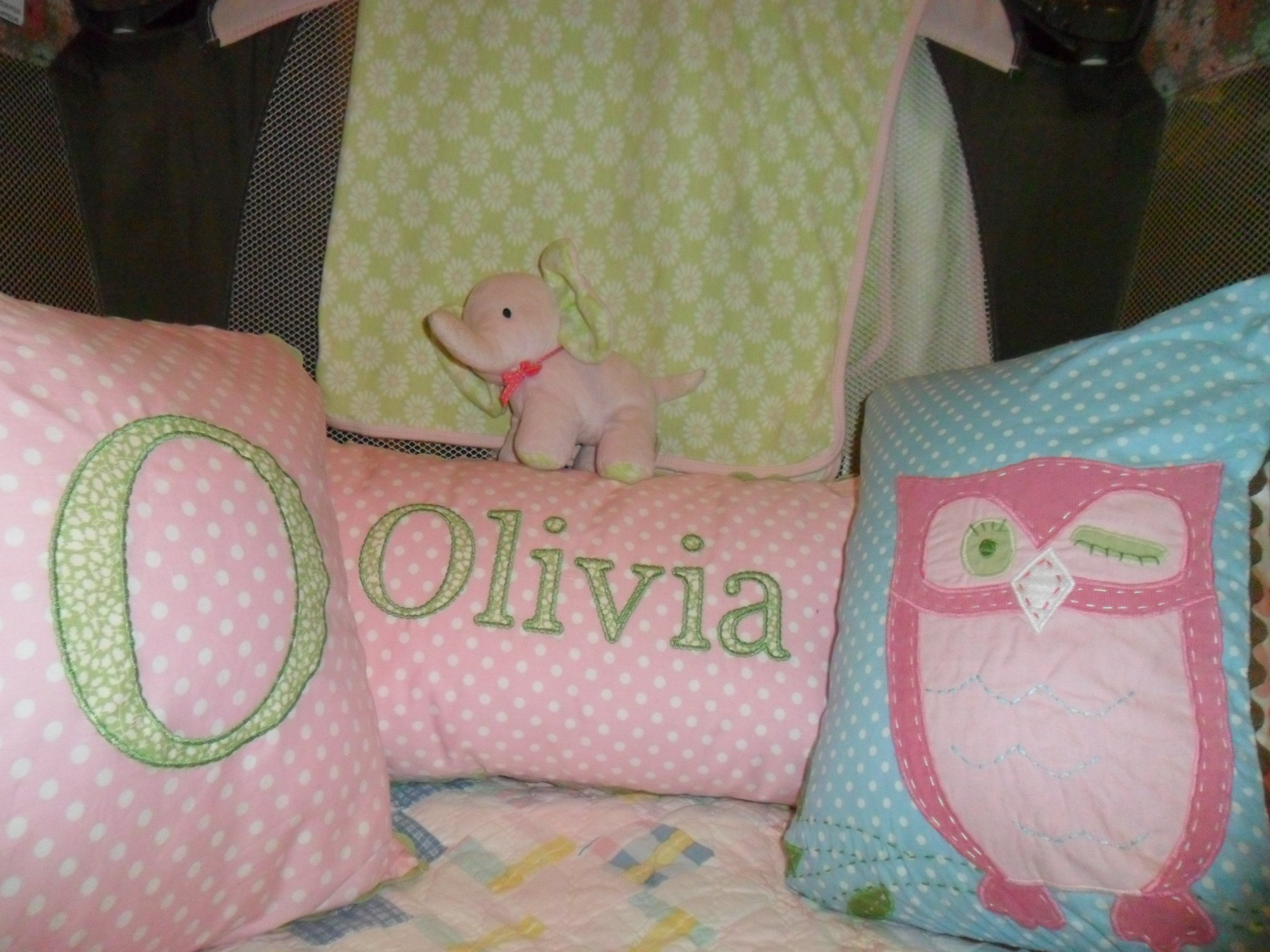 Lately Olivia has been spending a lot of time in her Pack -n – Play.  We have it in our living room.  She plays, naps, walks around – she actually likes it.  It’s her own personal space.  I have a pink, blue and yellow patchwork quilt in there.  It’s a twin size and the matching one is on the twin bed in her nursery.  When I saw these adorable pillows on clearance at Pottery Barn Kids, I knew they would look really great in her Pack – n – Play.