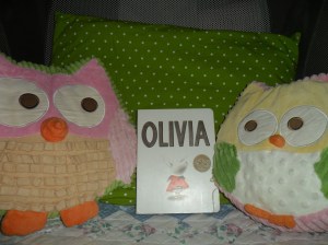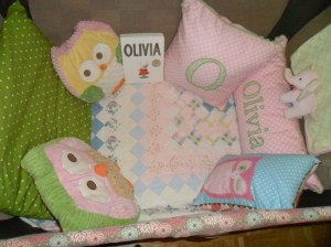 I use different patterns but try to stay in the same color palette.  The new “O” pillows are polka dot, the quilt is patchwork, and a lot of Olivia’s sheets and blankets are yellow gingham.  What patterns do you like to mix?  Leave a comment and let me know if you like my new owl merchandise.