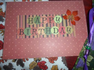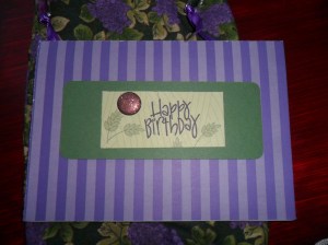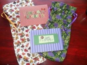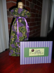A coworker asked me the other day if I had any of my fabric wine bags and a matching birthday card for sale.  I went home to see what wine bags I had and found two.  One was an autumn theme with leaves and the other purple grape leaves.  I decided to make a matching card for each so she would have a choice.  Here is what I came up with: