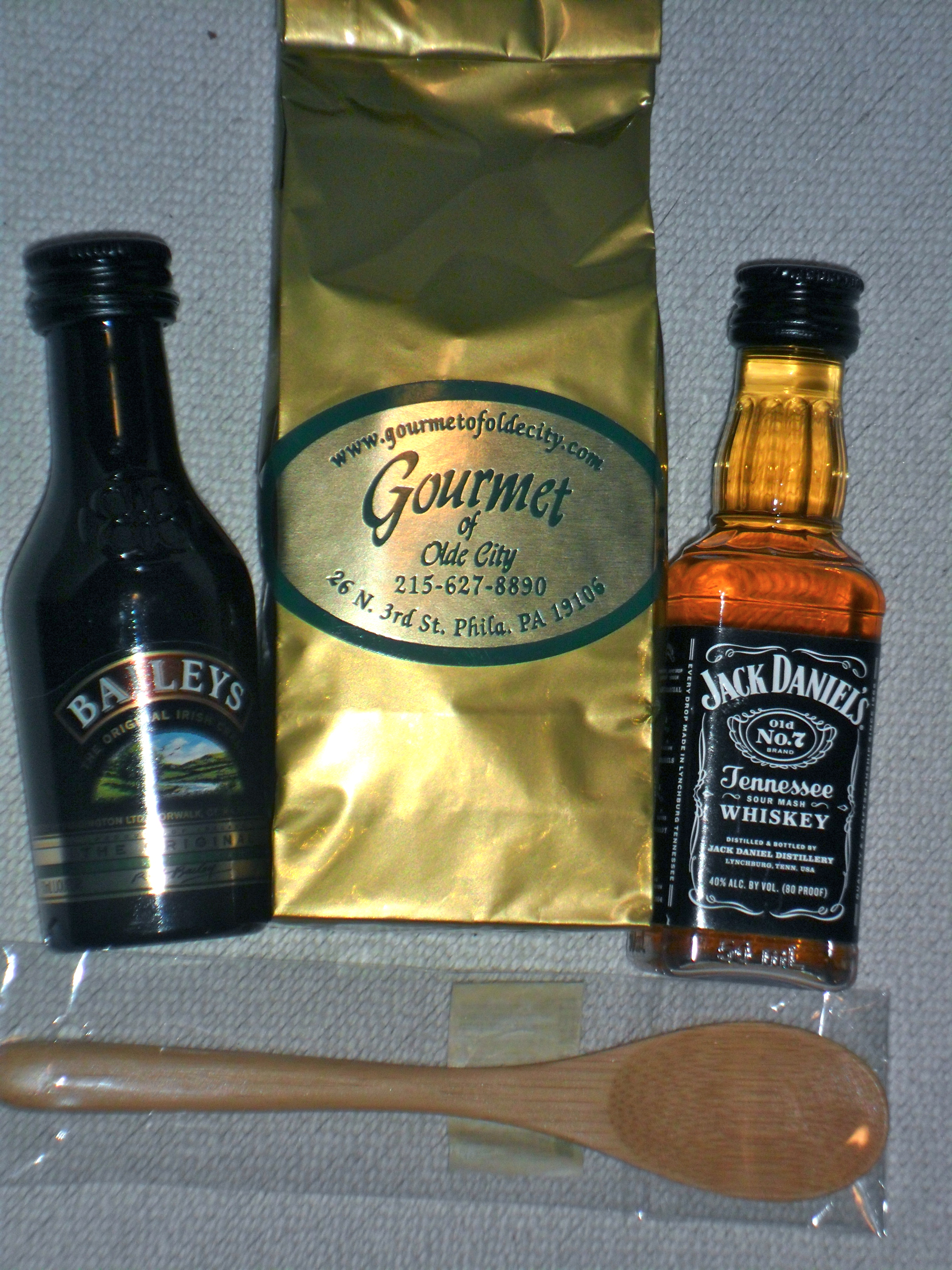 A small bag of coffee – which I get at at gourmet coffee store right near where I work. They package their coffee in gold and green – perfect, right? A nip of Bailey’s Irish Cream, a nip of whiskey, and a small wooden spoon.