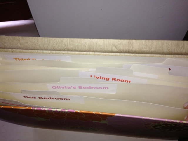 I decided the best way to keep everything straight was to divide up the projects by room. I had this accordion file folder that matched the binder I used above (both are from Target.)