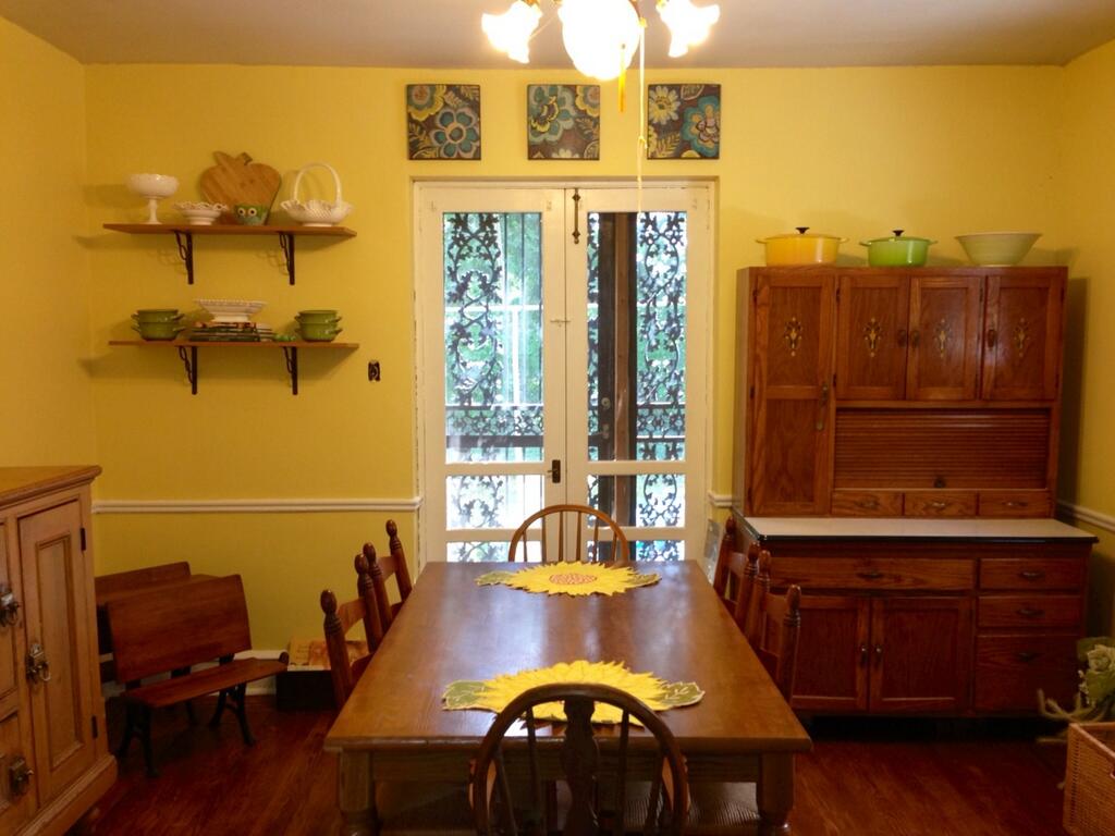 We painted the walls a pale yellow and the trim and chair rail a bright white.  We removed the mirrors and the wooden storm doors.