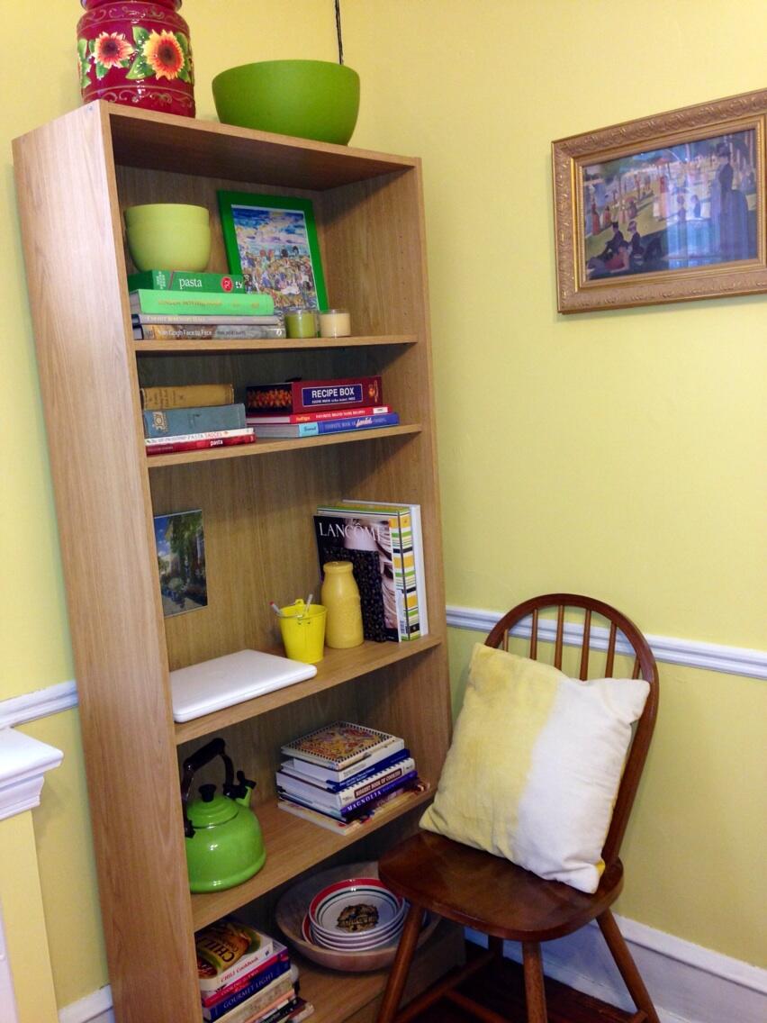 After living in our house for a few months, I realized that I was always using my laptop at the dining room table.  It is a great place to spread out all of my things – whether bill paying, blogging, or doing things for work.  I began to think that maybe I wanted my desk to be in the dining room.  Then I remembered this old bookcase and thought – this will be great for all my cookbooks and the larger shelf in the middle can serve as a work station. So this is where I keep my laptop, magazines, and my home organizational binder.  Everything is right at my finger tips and easy to move to the large table when I work.