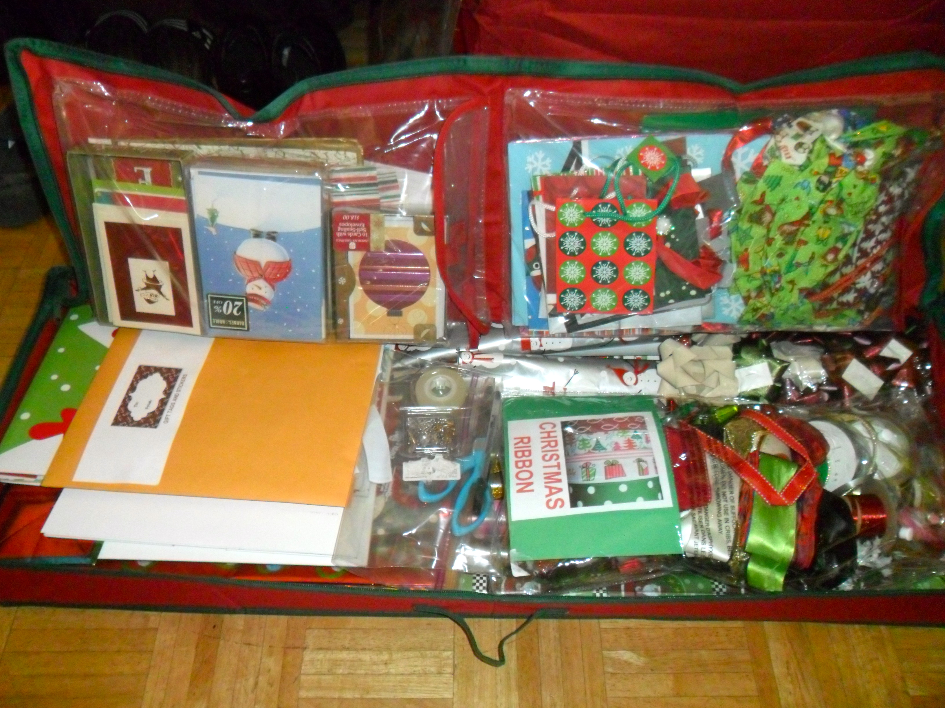 One thing I always try to keep as organized as possible is my Christmas wrapping materials.  I don’t keep this in my usual “wrapping storage” area which is a drawer in a bureau in my living room.  That drawer has gift bags and tissue paper readily available when I need to wrap something quickly.  My Christmas wrapping materials get stored away during the year.  I always buy wrapping paper the week after Christmas, when it is on sale, and then put it away for next year.  I never remember what the paper looks like – and it’s a fun little surprise when I unpack it the next December.