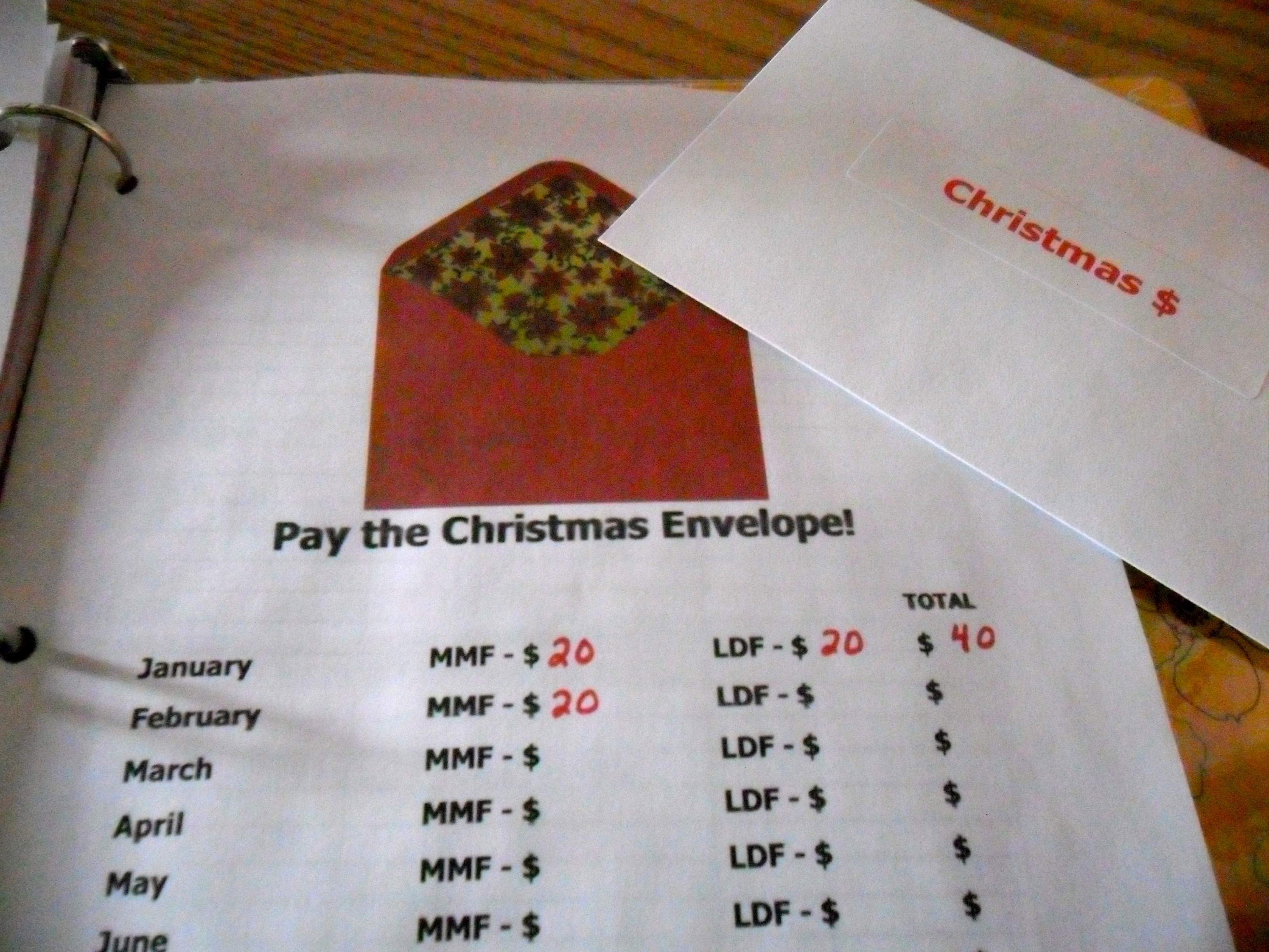Christmas Gift Storage bag Unlike the other storage bags that get tucked away into the Christmas corner of the attic – this one stays in a large wicker bin in the closet on our second floor.  All year long I add to it as I pick up items and gifts throughout the year for people.  Right before Thanksgiving I do an inventory and what I have and what I still need to get. Remember last year when I challenged you to shop throughout the year and pay a Christmas envelope each month (Helpful Hump-Day Hints 12.26.12?)  Did you do it? We paid our Christmas envelope $40 a month this year ($20 from me, $20 from my husband) so over 11 months that was $440 we had in cash to use at Christmas. Some things it paid for – stamps for Christmas cards, new lights we needed for our tree, and groceries for our holiday meals.  I keep a record (shown below) with the envelope and keep it in our Home Organization Binder.  That way it is visible all year and we won’t forget about it.