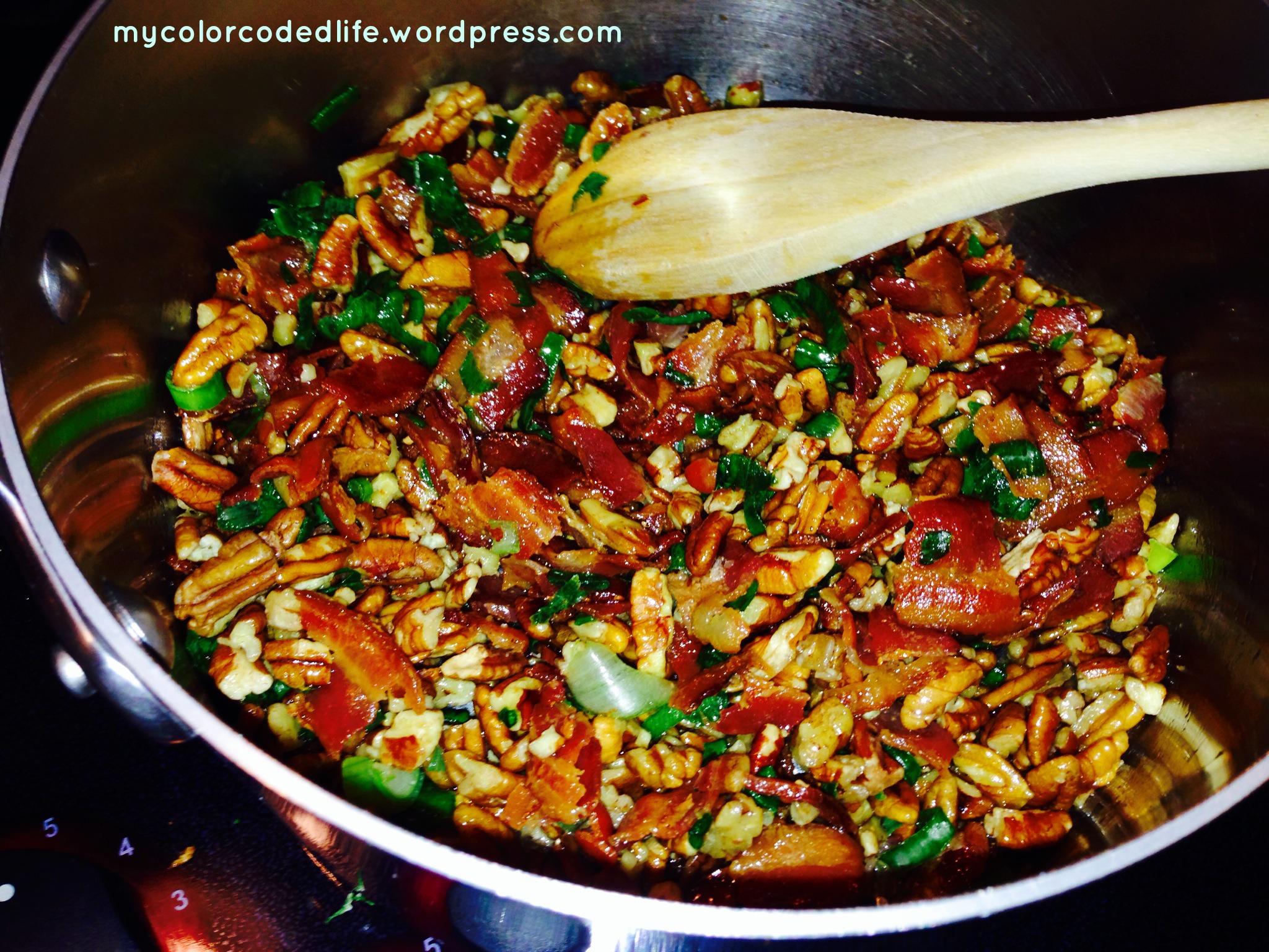 Heat skillet over medium and render bacon until almost crispy. Add pecans and scallions, and toast for 1 minute. Add remaining ingredients. Simmer until mixture has reduced by one – third whisk in butter just before serving.