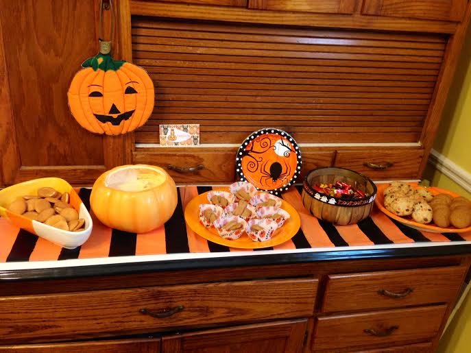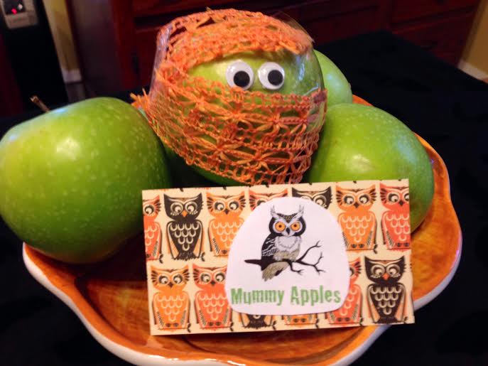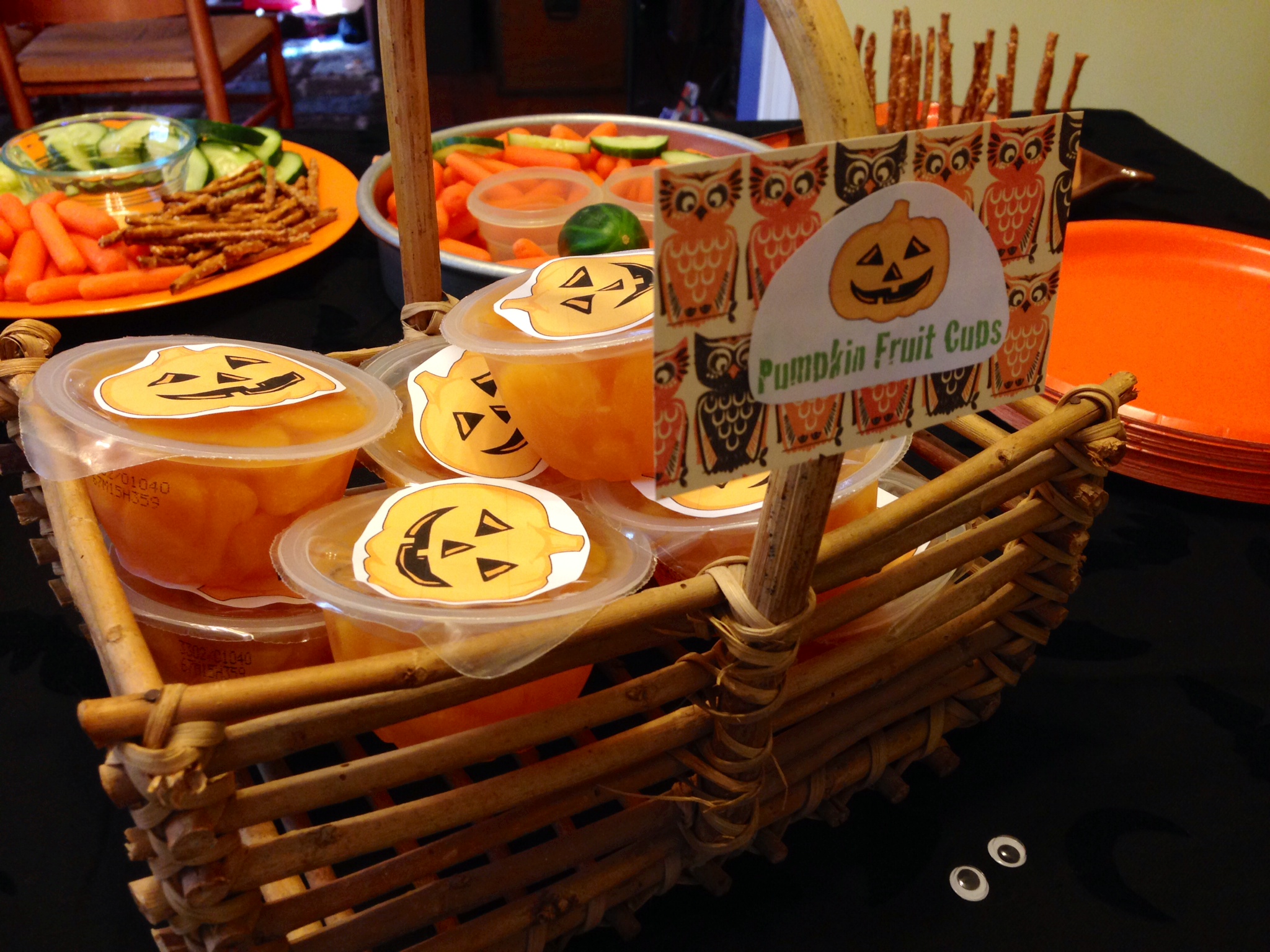 pumpkin fruit cupsI tried to draw the pumpkin faces on the fruit cups, but I did not have the right type of black marker (or these fruit cups had a plastic that you can’t draw on.)  I printed out jack-o-lanterns instead.  I also put random googly eyes around the table on the black table cloth.