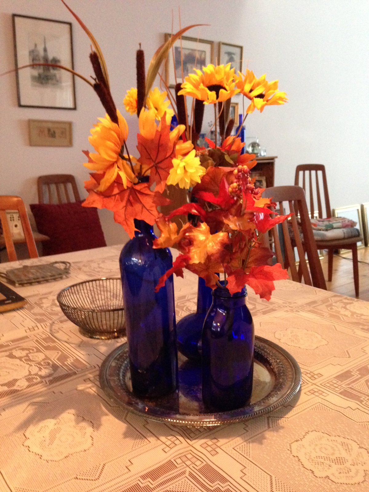 I sent a quick text to my sister including this pic because she collects blue glass. I thought it was a great way to incorporate fall colors with a blue glass collection.